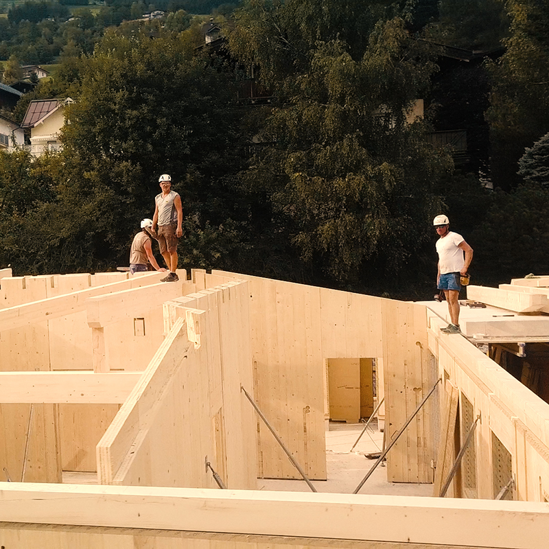 Mit unserer effizienten Bauweise steht dein Holzhaus in Rekordzeit. Durch die vorgefertigten Bauelemente steht der Rohbau in wenigen Tagen und du hast in Summe eine 45% kürzere Bauzeit als bei anderen Bauweisen. Und das Beste: Du kannst dann auch direkt einziehen, da lange Trocknungszeiten nicht nötig sind.