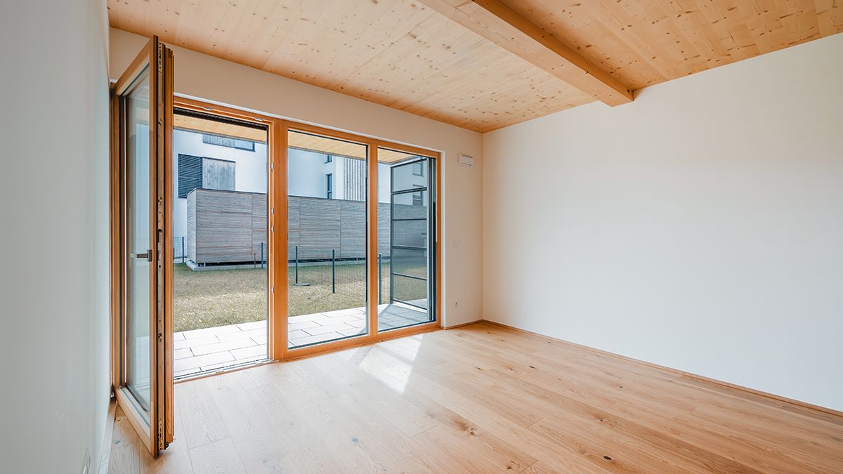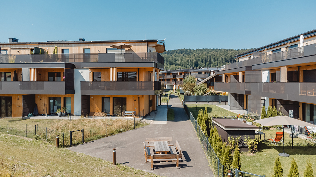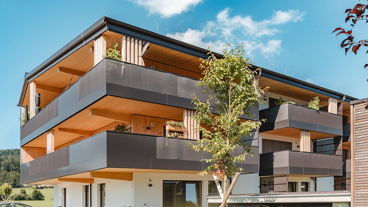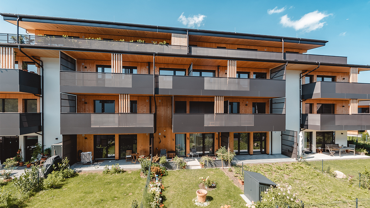 Hier entstand Österreichs erster Vollholz-Wohnbau aus PEFC-zertifizierter Forstwirtschaft mit insgesamt 70 Wohneinheiten – davon 60 Eigentumswohnungen und 10 Mietwohnungen mit Wohnflächen von ca. 52 m² bis 110 m².